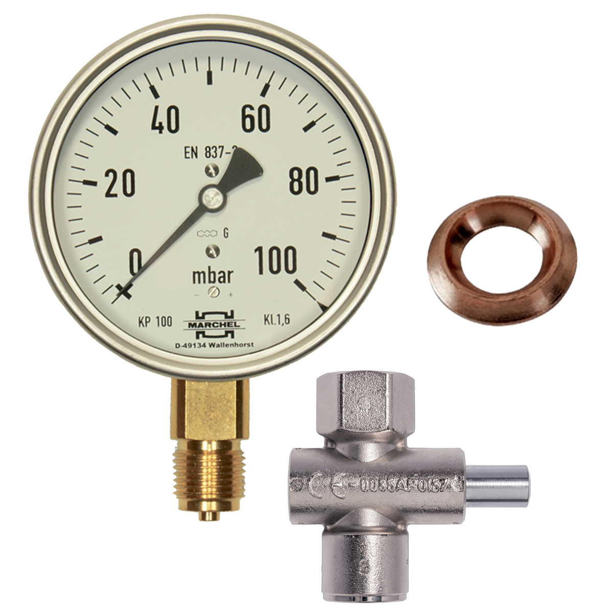 Kit manomètre avec plage de mesure 0-100 mbar et un diamètre de 100 mm fourni avec un robinet 1/2" et son joint.